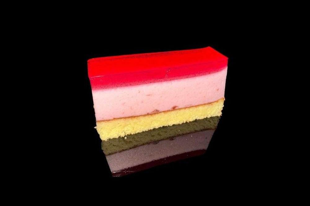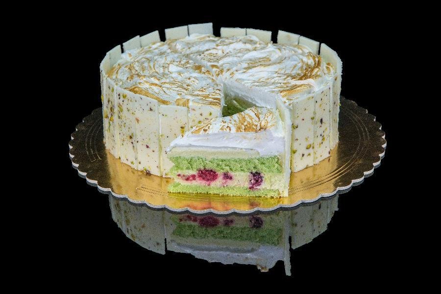 múka, cukor,vajcia, olej, farbivo (fruktózovo-glukózový sirup, chlorofil) mascarpone (pasterizovaná smotana), živočíšna smotana (smotana, stabilizátor:karagénan) ovocie (mrazené), pistácie (blanšírované) vaječné bielka, Hmotnosť cca 1800g